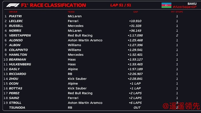 第四至第十分别是:诺里斯、维斯塔潘、阿隆索、阿尔本、科拉平托、汉密尔顿和贝尔曼。中国车手周冠宇第14完赛。